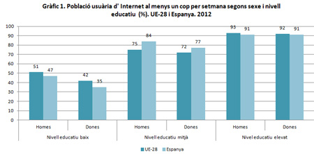 En relació a la inclusió digital (Gràfic 1), detectem que les dones a la Unió Europea presenten menors percentatges d'inclusió que els homes en tots els nivells educatius, excepte per a les dones espanyoles amb nivell d'estudis alt que presenten xifres similars als homes (91%). Per tant, podem constatar que a mesura que augmenta el nivell d'estudis també s'incrementa el percentatge de persones usuàries d'Internet i, per tant, la disminució de la bretxa digital de gènere.