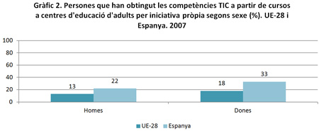 Pel que fa a les persones que han adquirit competències digitals a través de cursos de formació per a persones adultes (Gràfic 2), veiem que a Espanya l'educació d'adults relativa a les competències digitals és més elevada que a la mitjana de la UE-28. Respecte a les diferències de gènere, un 33% de les dones han adquirit algunes de les competències digitals a través de cursos de formació en l'educació no formal, xifra molt superior al 18% de les dones que suposa la mitjana europea i al 22% dels homes a Espanya.